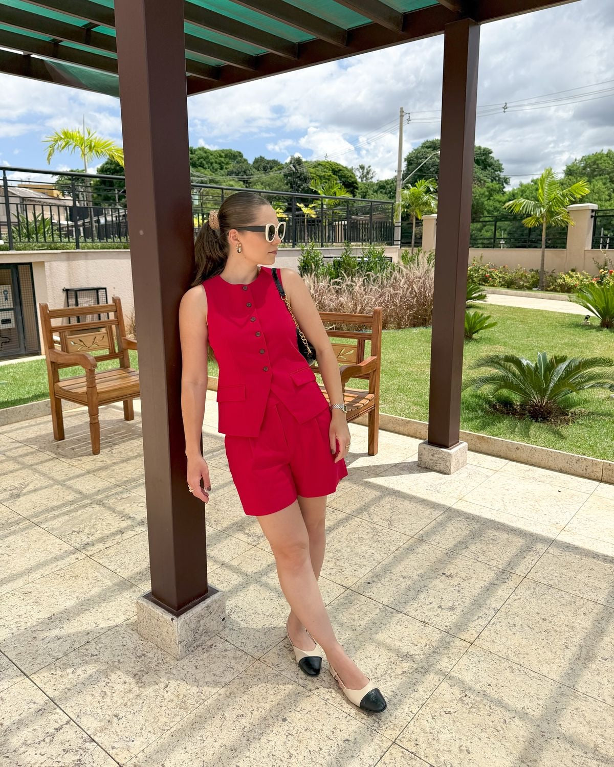 Short tipo sastre con prenses, bolsillos laterales, tiro alto, tejido plano liviano, silueta amplia.