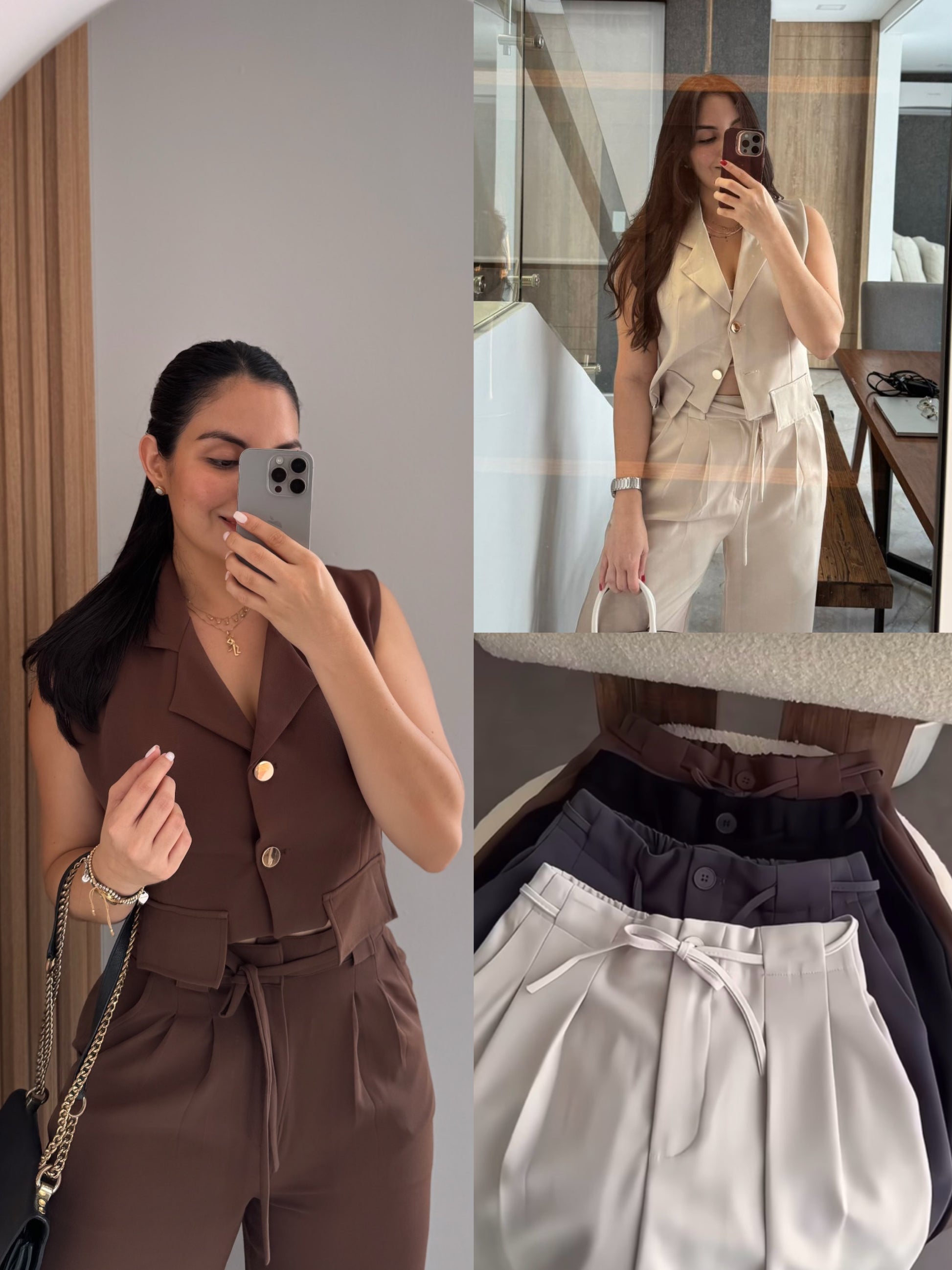 Pantalón tipo sastre con prenses, bolsillos laterales, resorte en la cintura, tiro alto, tejido plano liviano, silueta amplia.