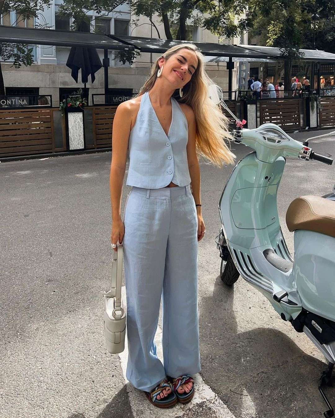 Pantalón en lino sin prenses, bolsillos laterales, tiro alto, tejido plano liviano, silueta amplia.