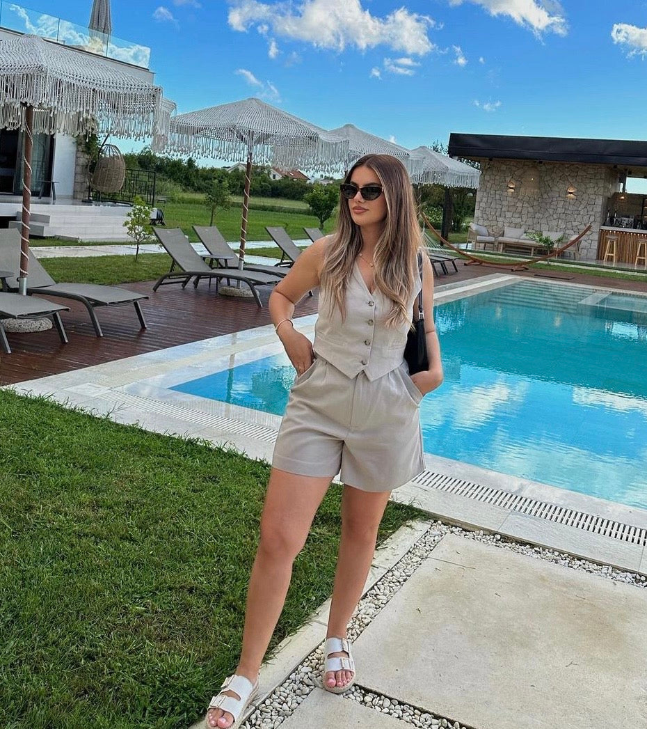 Short tipo sastre con prenses, bolsillos laterales, tiro alto, tejido plano liviano, silueta amplia.